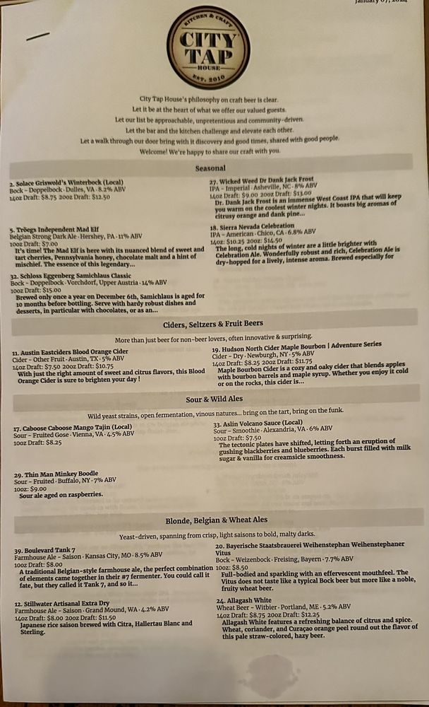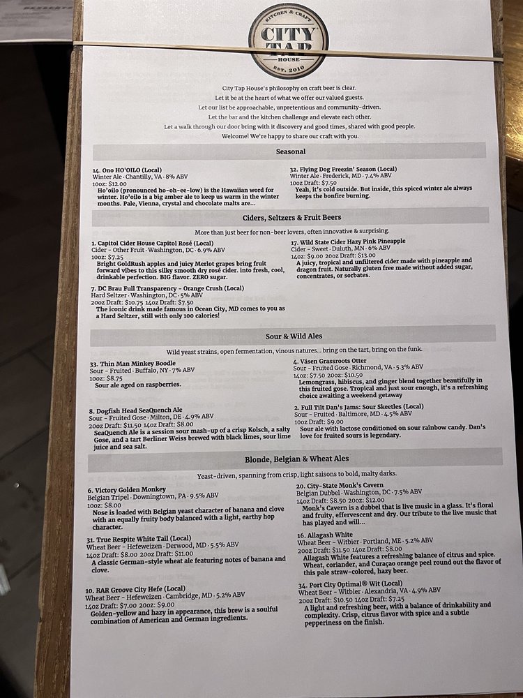 The attentive and friendly staff, including bartender Jorden and managers Chanel and Greg, contribute to a flawless dining experience. The extensive list of brews, full bar, and happy hour specials make it a great spot for groups, families, and quick bites. The restaurant also offers outdoor seating, TV screens, and free Wi-Fi, ensuring a comfortable dining experience. Overall, City Tap House Penn Quarter is a must-visit for food enthusiasts looking for quality meals in a trendy and casual setting.